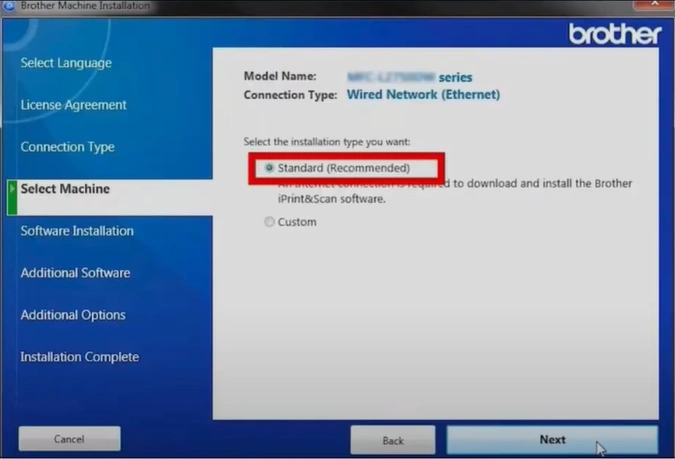 15. In the installation type, choose the Standard (Recommended) radio button and then select Next.