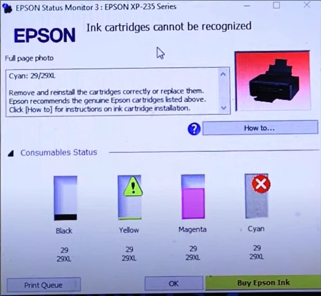 1. Ensure that the "Ink Cartridge Not Recognized" error message displays on your printer or computer.