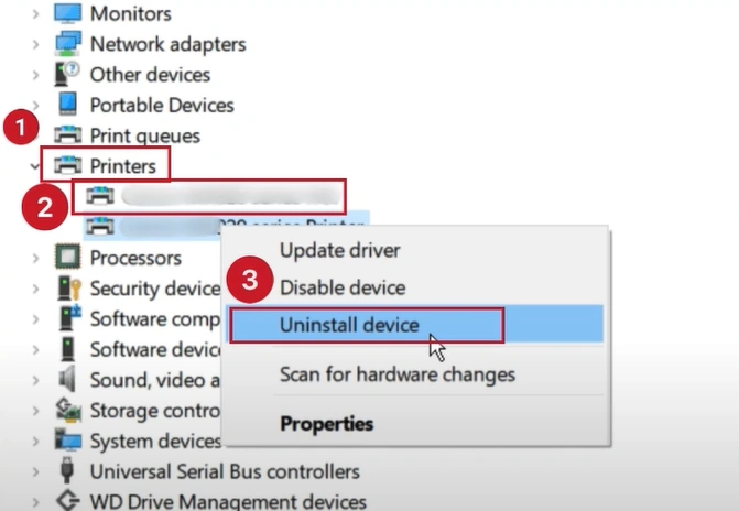 2. On the next page, scroll and expand the Printers section, then right-click on the printer and select Uninstall device.