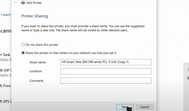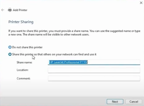 21. Now, in the Printer Sharing window, click on the Next button.