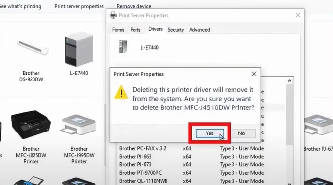 9. Click Yes to delete the printer driver.