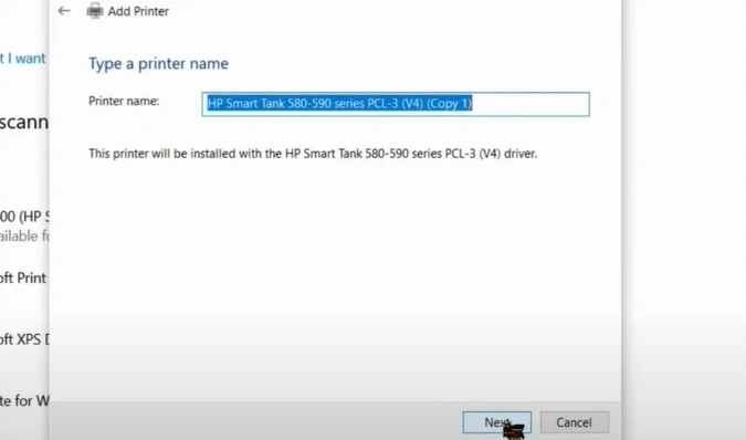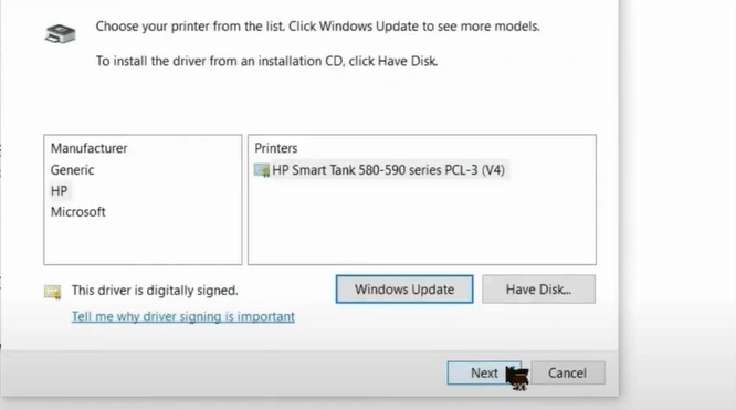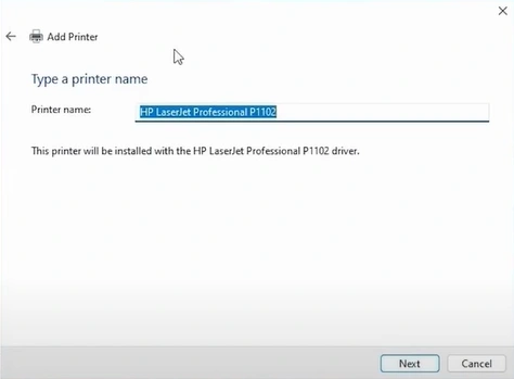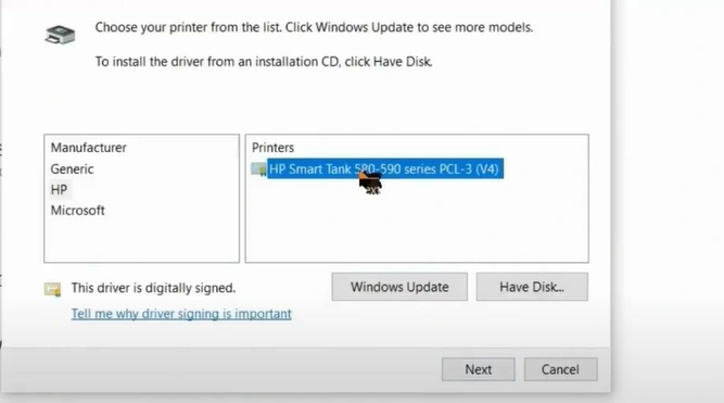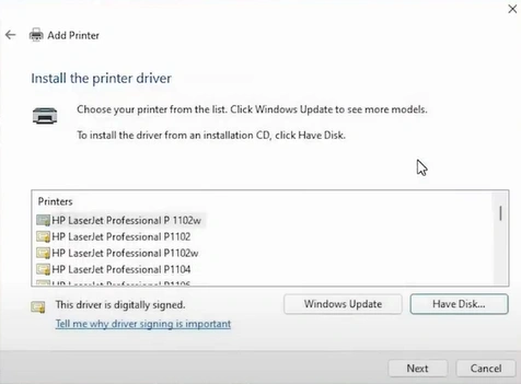 27. Select your HP printer model and click on Next.