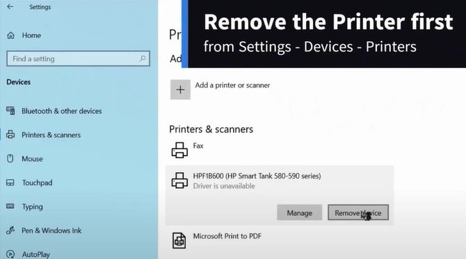 4. Right-click on your printer device, select Remove device, and click Yes.