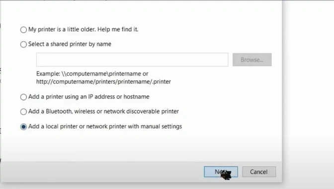 22. Select the "Add local printer or network printer with manual settings" option and click on Next.
