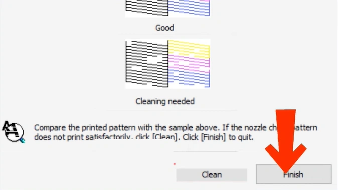 Step 15: The printer will print a nozzle check. Compare it with the sample shown on the screen. If you find any gaps or faint lines, click on “Clean.”
