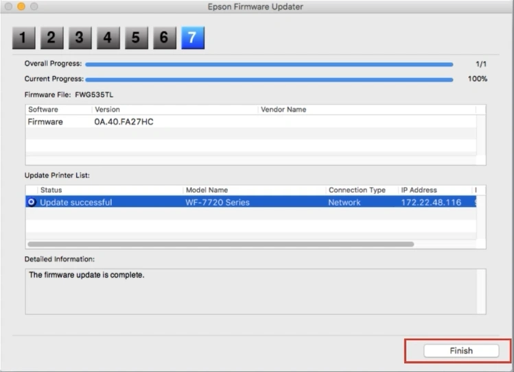 19. After the successful update, click on the Finish button.