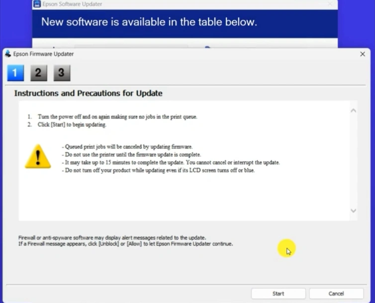 18. Now, return to the Epson Firmware Update dialog box, then click on the Start button.