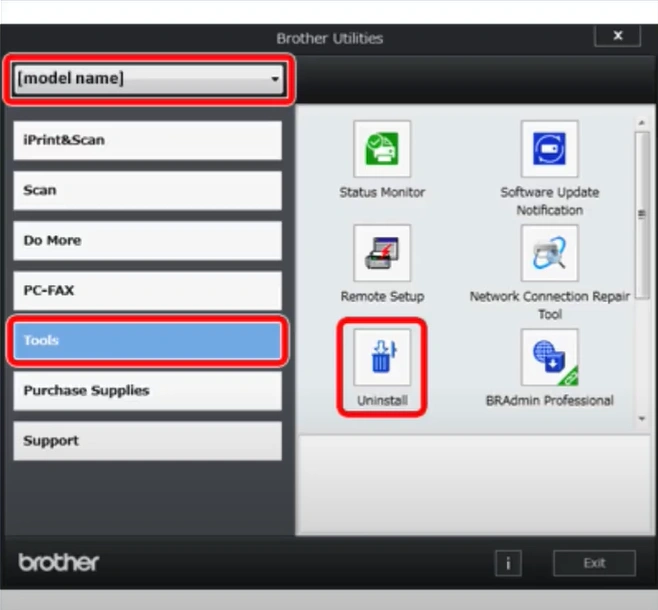 2. Select your model name from the drop-down, open Tool in the left panel, and click on Uninstall.