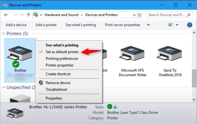 3. Right-click on your Brother printer and select the “Set Printer as default” option.