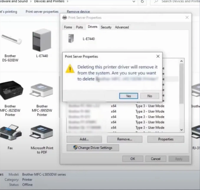 4. Right-click on your Brother printer, select Remove, and click Yes.