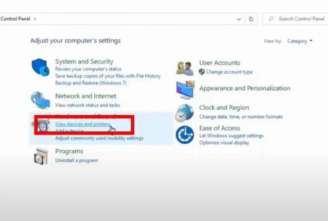 1. Open the control panel window and click on View devices and printers.