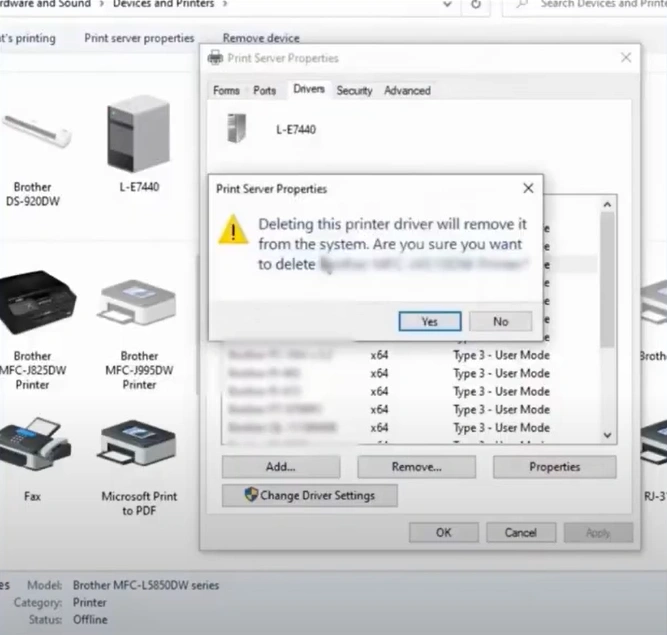 9. Click Yes to delete the printer driver. (Note- if a window appears with "printer driver is currently in use," reboot your computer and perform all steps again.)