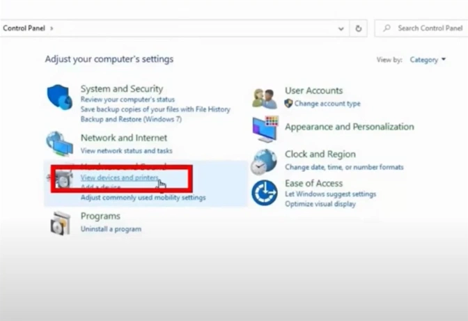1. Open the Control Panel page and click on View devices and printers.