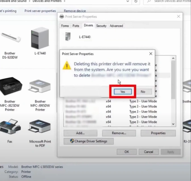 9. Click Yes to delete the printer driver. (Note- if a window appears with "printer driver is currently in use," reboot your computer and perform all steps again.)