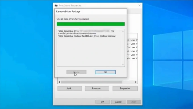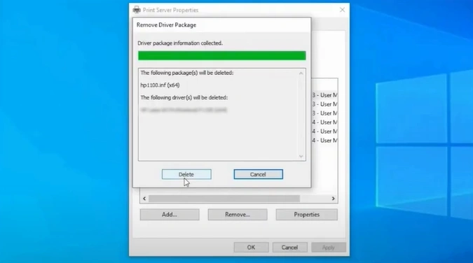 15. In the Remove Driver Package window, click on the Delete button.
