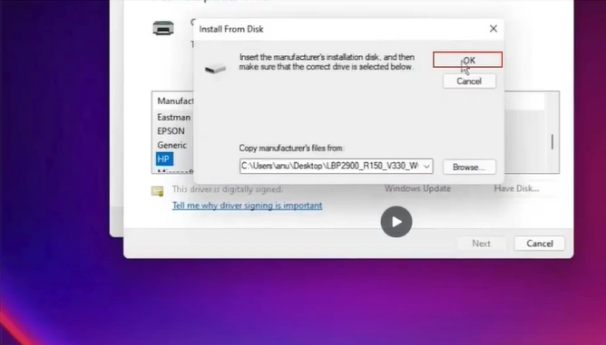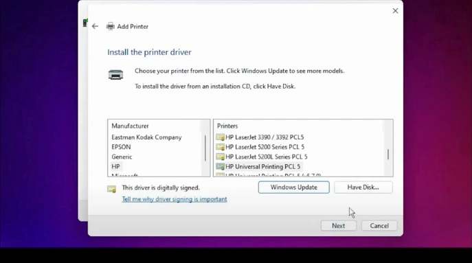 30. In the Add Printer window, click on the “Have Disk” option.