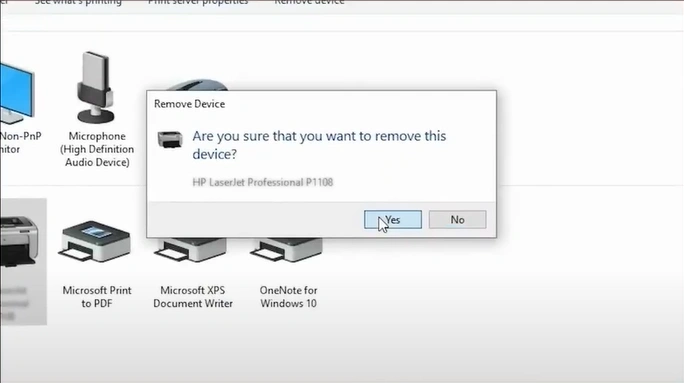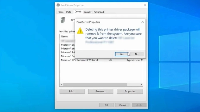 14. In the Printer Server Properties pop-up, click on Yes to confirm the deletion of the printer driver from the system.