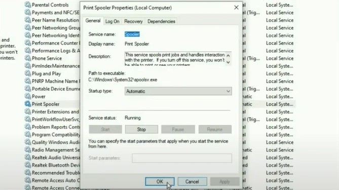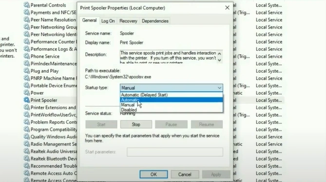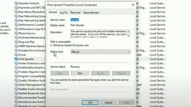 10. In the Print Spooler Properties window, go to Startup Type.