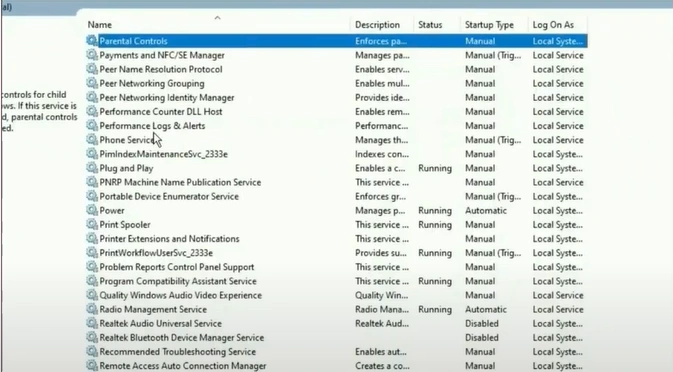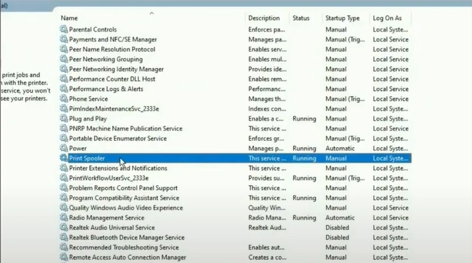 7. In the Services window, scroll to find the print spooler.