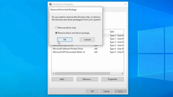 12. Choose the Remove driver and driver package option.