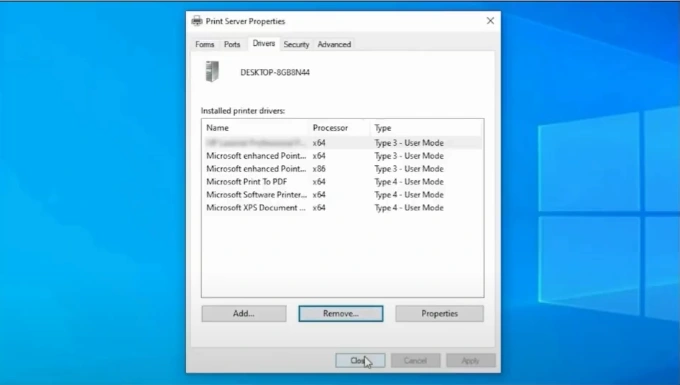 17. Click on Close in the Printer Server Properties window.
