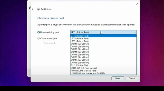 29. Choose the “Use an existing port”, select the “USB_001” from the drop-down, and click on Next. (Note- Select com4_001 or any Canon port option if the USB option is unavailable.)