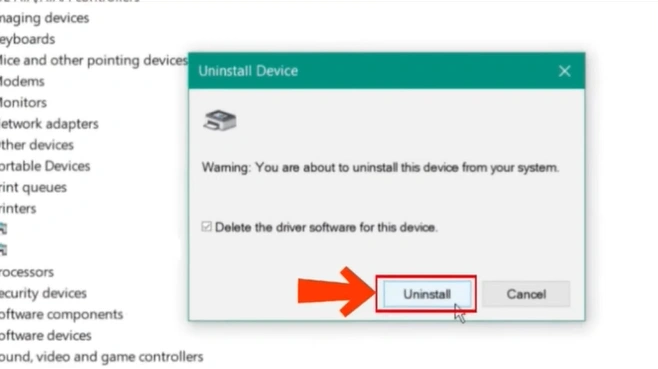 Step 3: In the Uninstall Device window, check the “Delete the driver software for this device” option and click the Uninstall button.