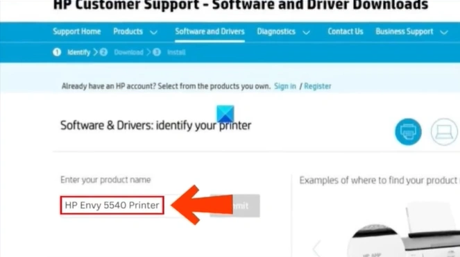 Step 8: On the next page, type your printer model number in the search box and click the “Submit” option.