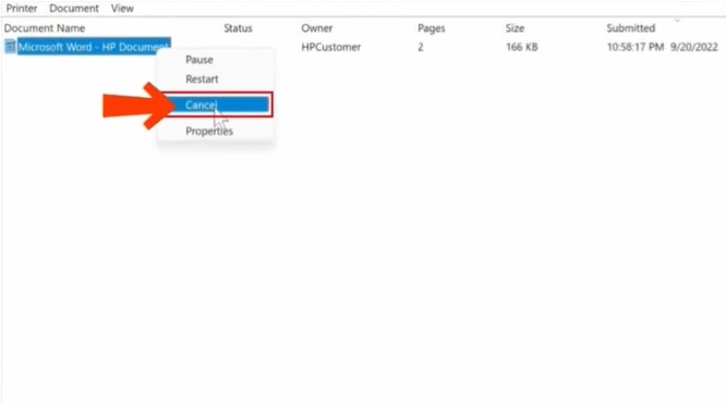 Step 2: Right-click on the print job you wish to cancel. Select “Cancel” from the list.