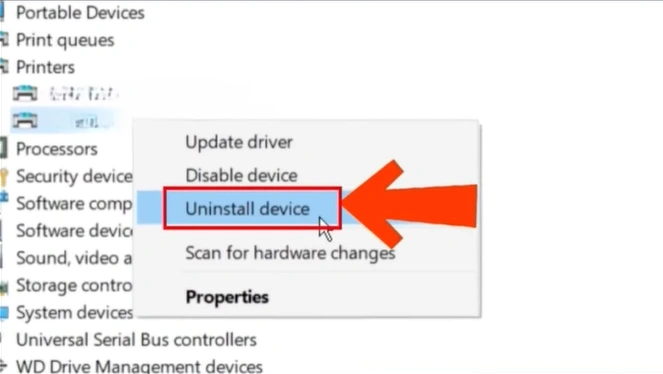Step 2: Scroll and expand Printers, then right-click on the printer and select Uninstall device.