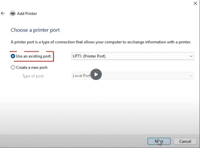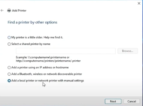 22. Select the “Add a local printer or network printer with manual settings” option and click on Next.