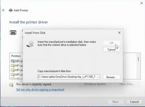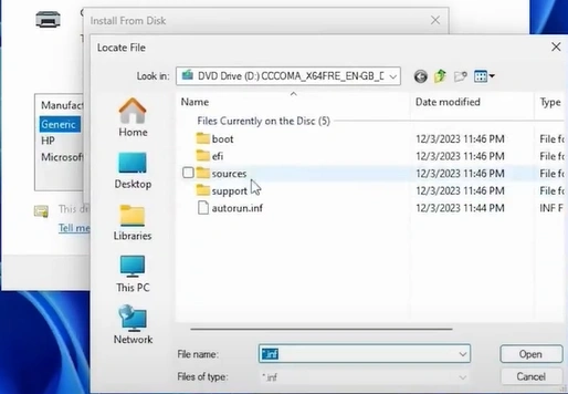 27. Click on Browse, open the extracted file, then open any “.INF” file.