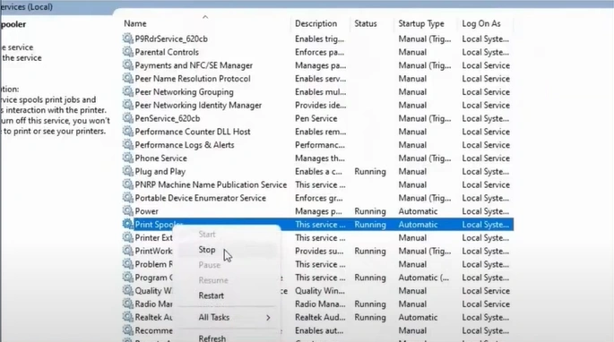 6. Right-click on your print spooler and select Stop.