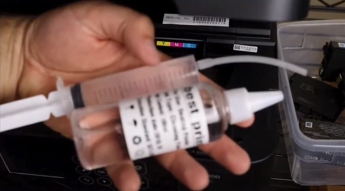 11. Grab a syringe with a plastic tube attached and head cleaning solution.