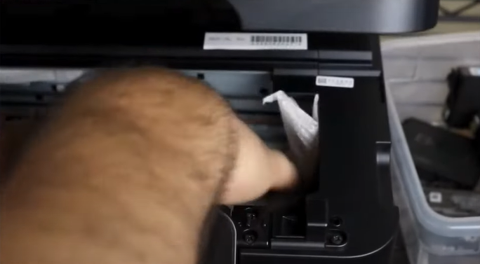 14. Clean the other clogged nozzle head while ensuring the paper towel protects the platform from getting wet.