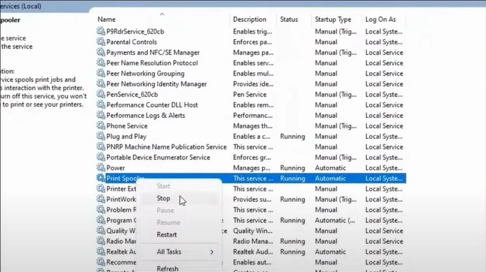 4. Right-click on the Print Spooler and select Stop.