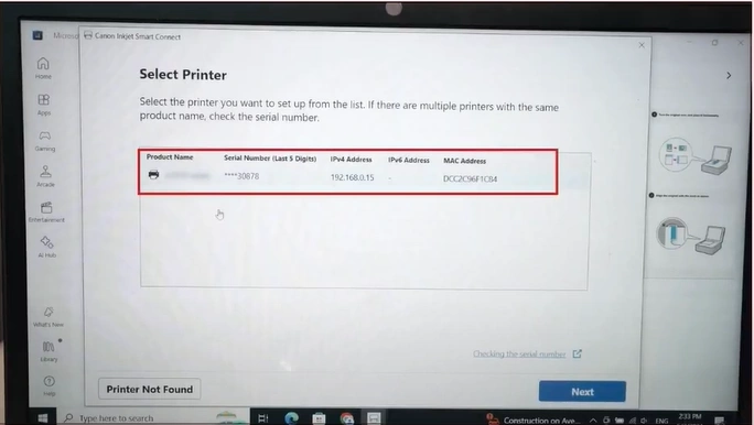 27. Now, from the list of available printers, select your printer and click on Next.