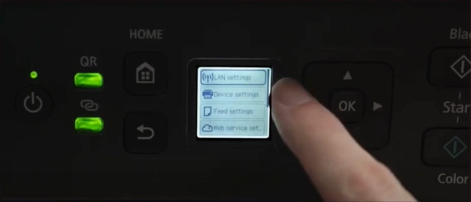 1. First, scroll down on the printer control panel and select Settings.